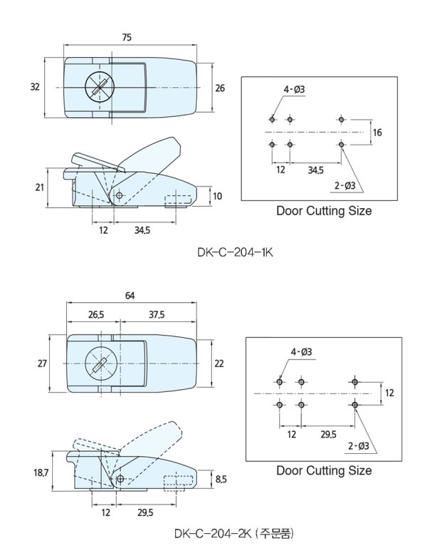 C파트 | DK-C-204(주문형) 페이지 정보 작성자 최고관리자 작성일16-11-24 22:57 조회2,200회 관련링크 이전글 다음글 목록 본문 CATCH CLIP ■ 재 질 : 아연합금(ZDC) ■ 표면처리 : 크롬무광도금(CV), 크롬도금(CR), 흑색 도장(BK) ■ 특 징 : 진동시 LOCKING장치로 열림방지 / DK-C-204 : 키 장치 없음 / DK-C-204-K : 키 장치 있음 이전글 다음글 목록